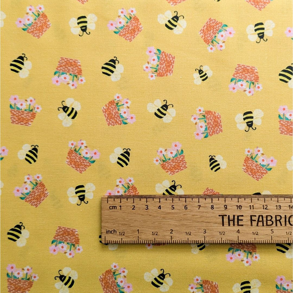 A sweet honey-yellow quilting cotton featuring bumblebees and wicker baskets brimming with pink flowers in a playful, hand-painted style.