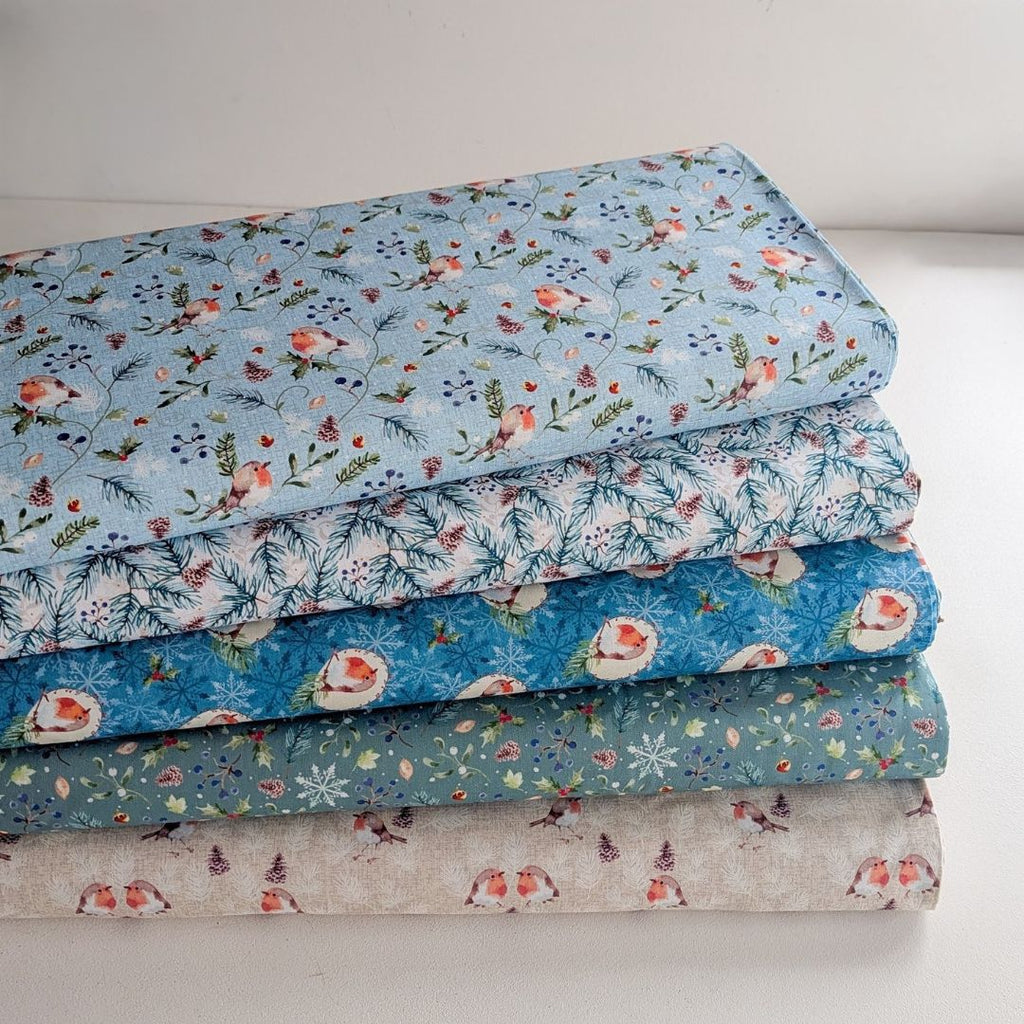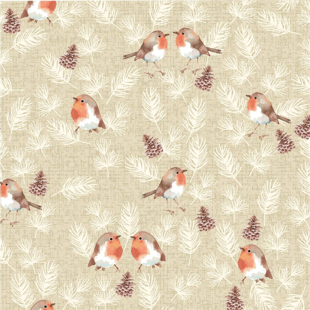 This beautiful fabric features cheerful robins, some in pairs facing each other, with delicate white pine branches and scattered pinecones on a light, textured tan background.