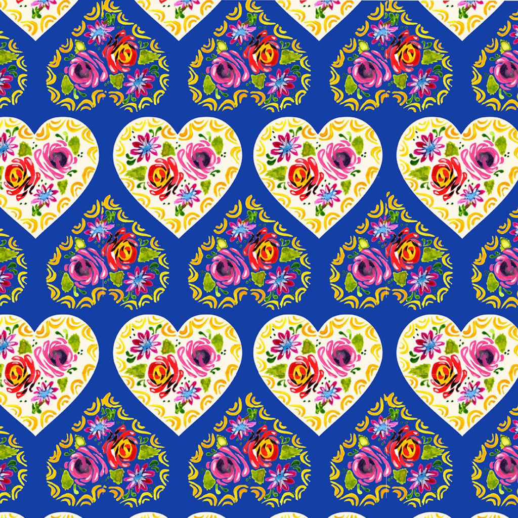 This incredibly vibrant fabric features a mix of white and blue folk art hearts filled with brightly painted roses and flowers, all set against a bold, striking royal blue background.