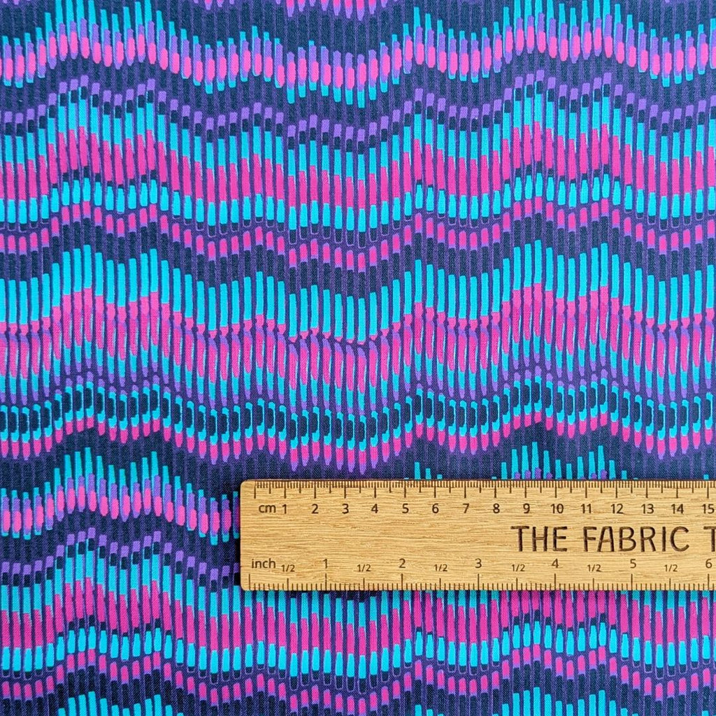 This stunning quilting cotton features a dense, abstract pattern resembling vertical brushstrokes or sound waves.  The design uses layered colours of fuchsia, teal, lavender, dark purple and navy - a really unique design.